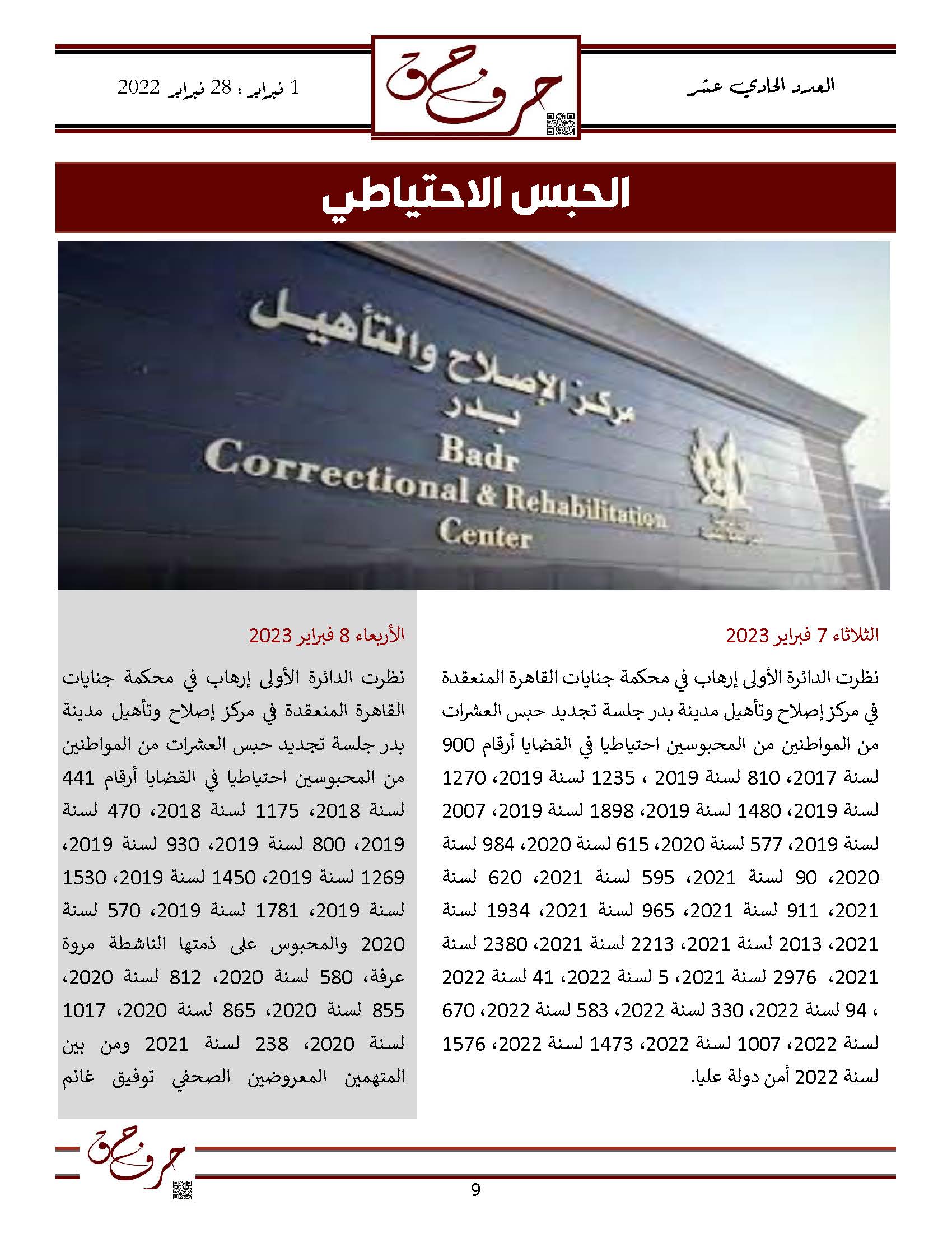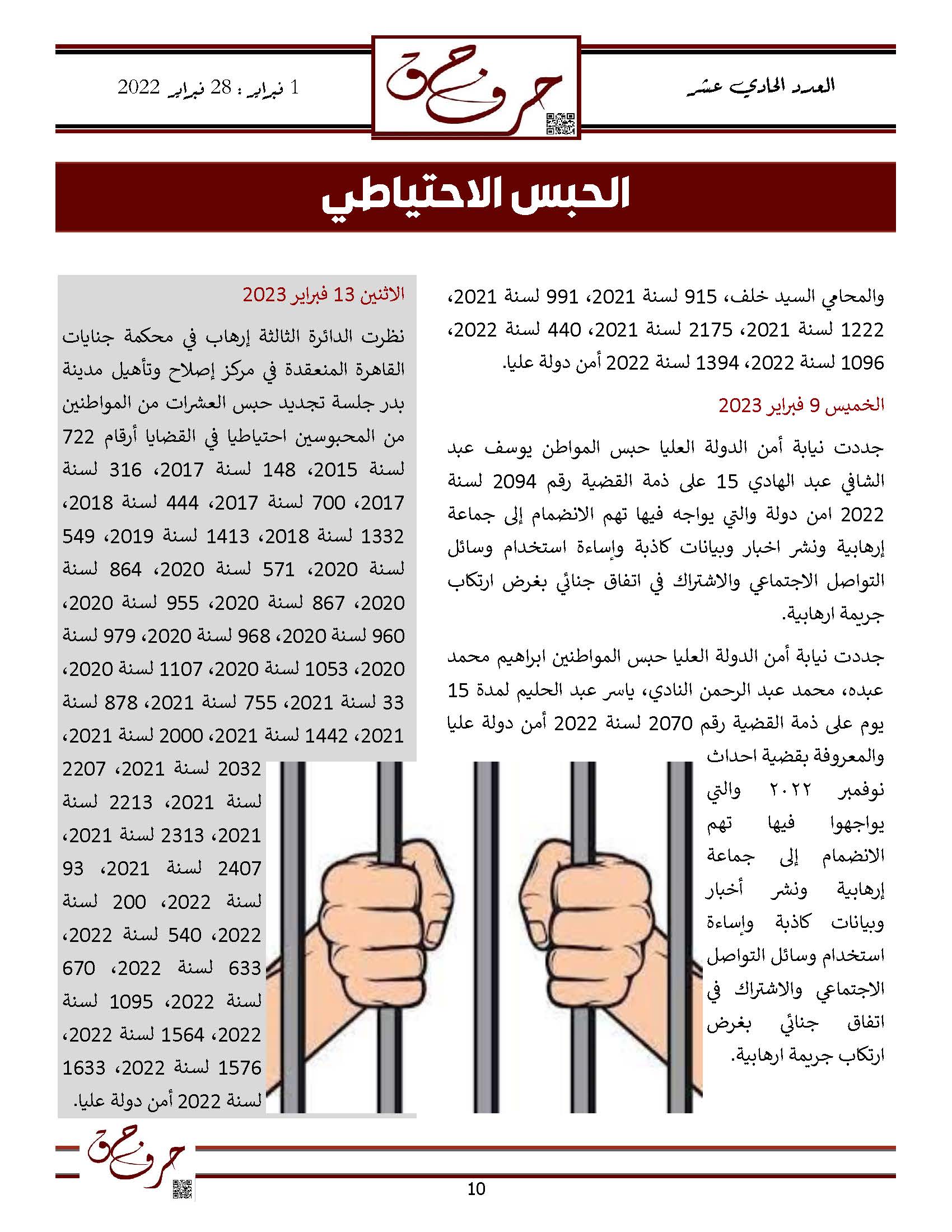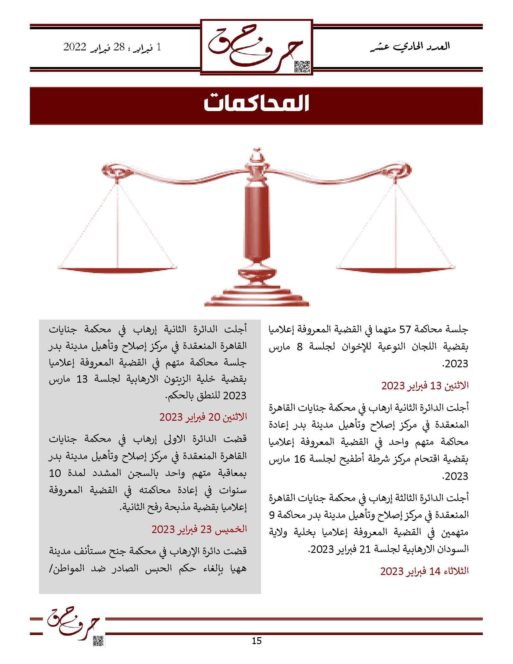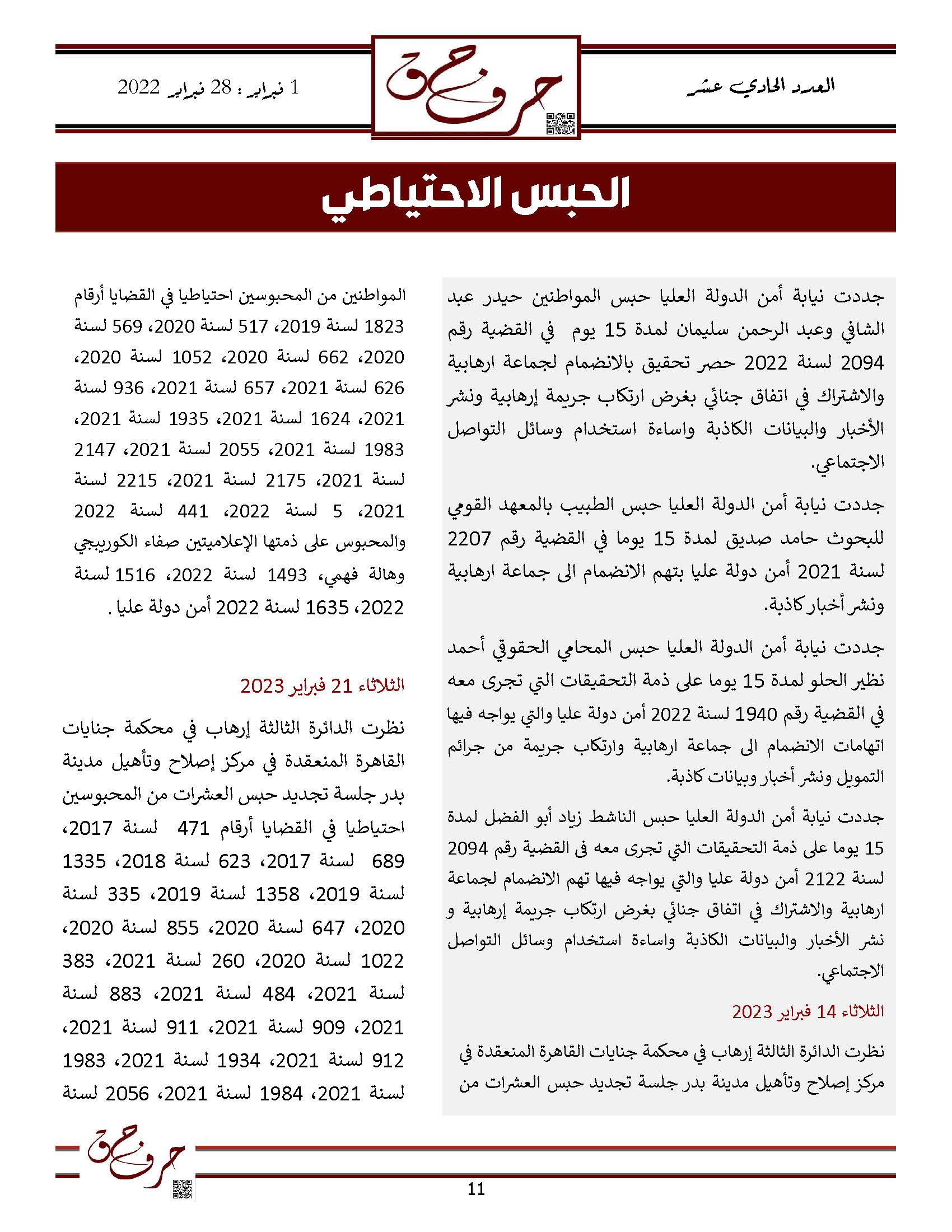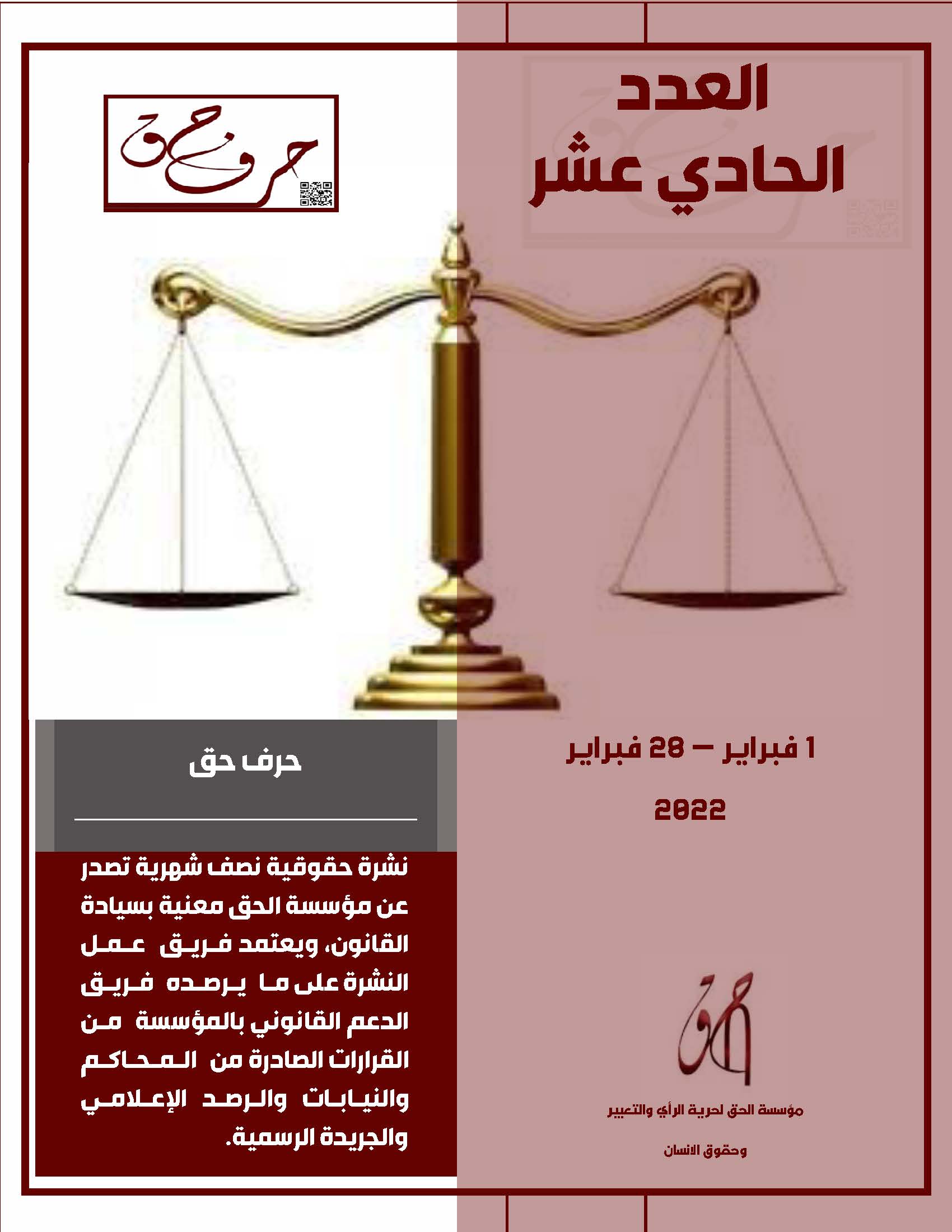 مؤسسة الحق تصدر العدد الحادي عشر من نشرتها الالكترونية ” حرف حق “ عن الفتره من 1 فبراير 2023 حتى 28 فبراير 2023