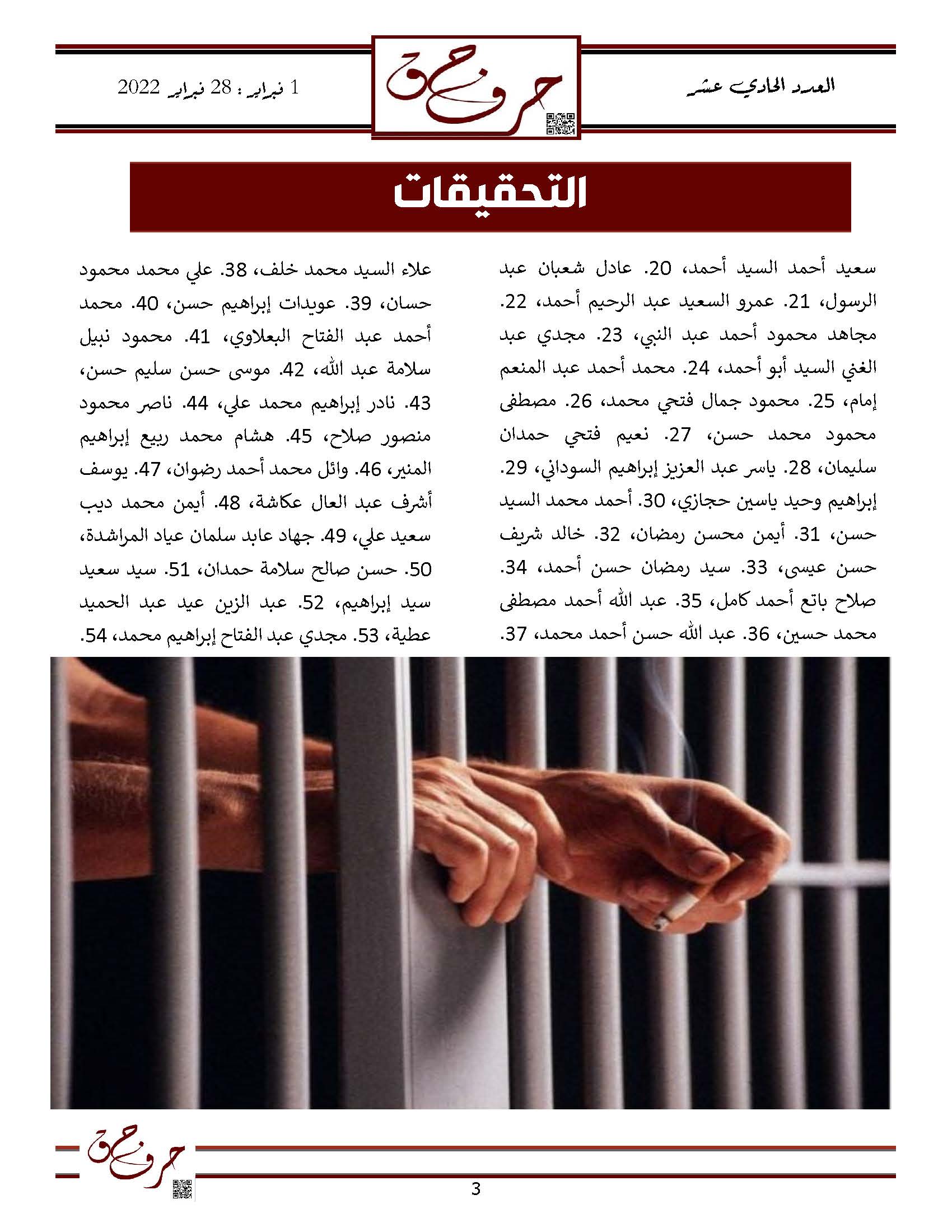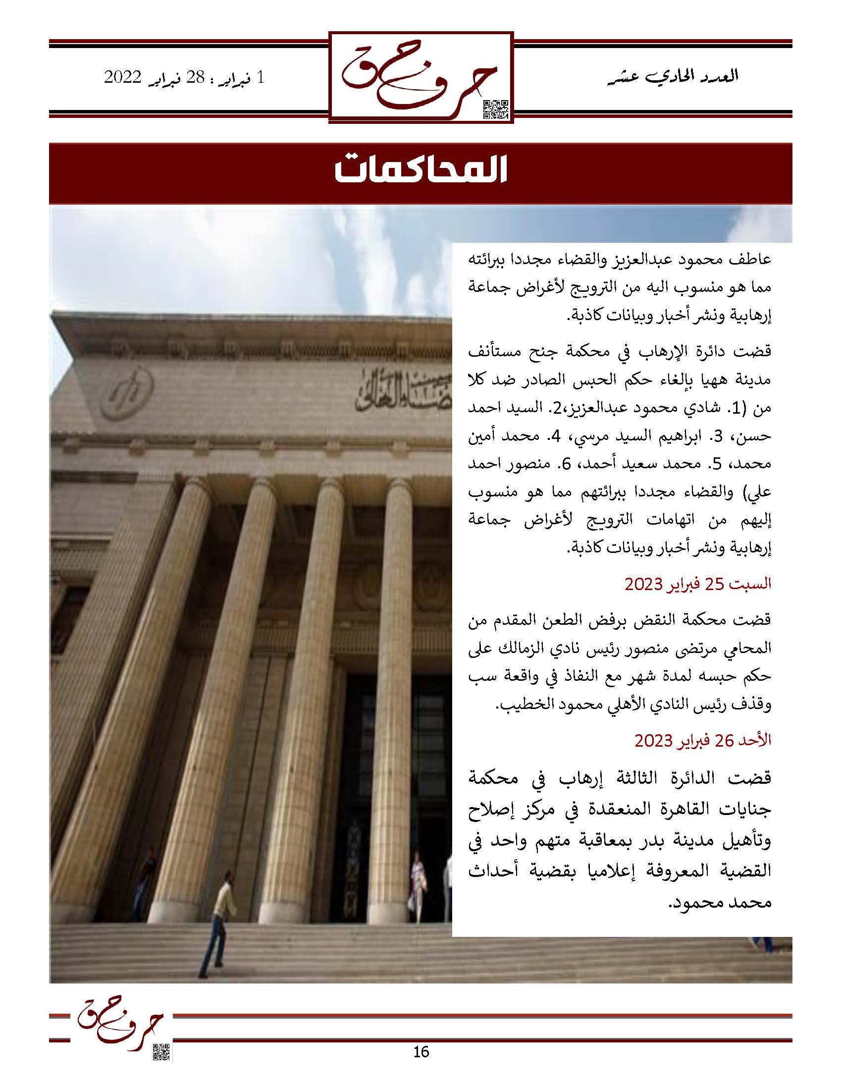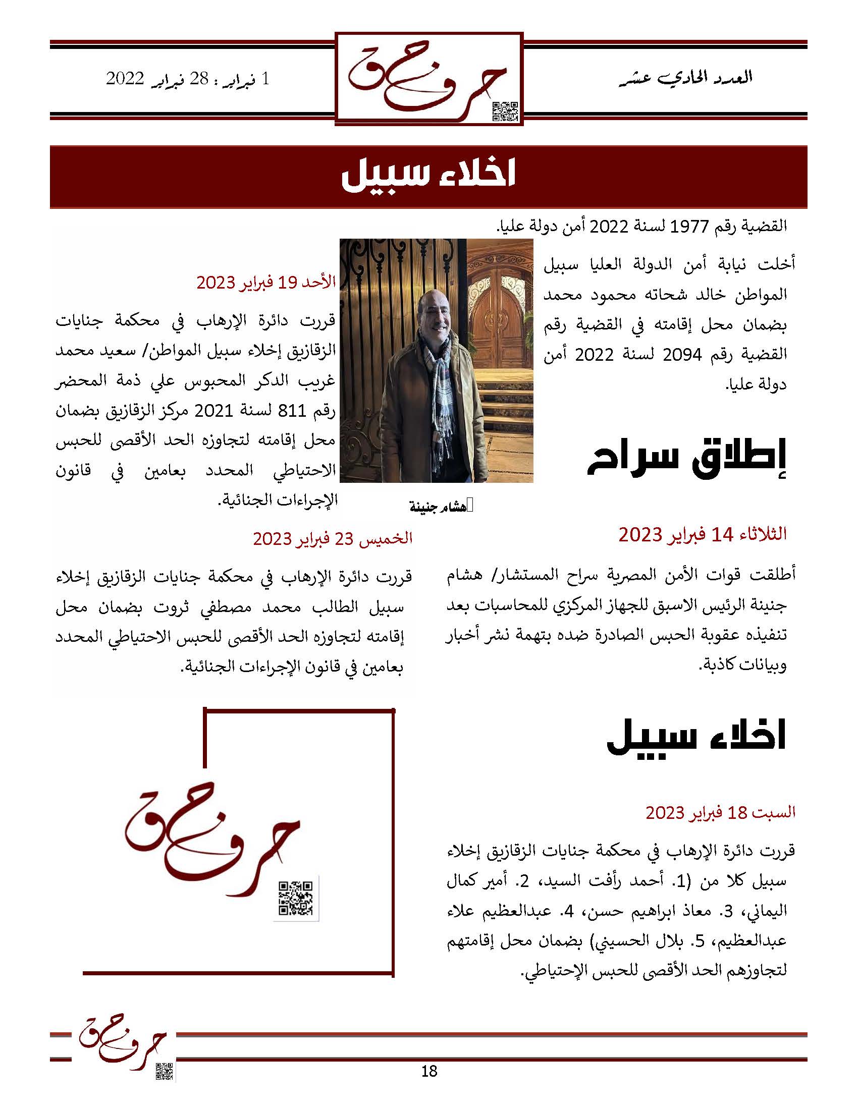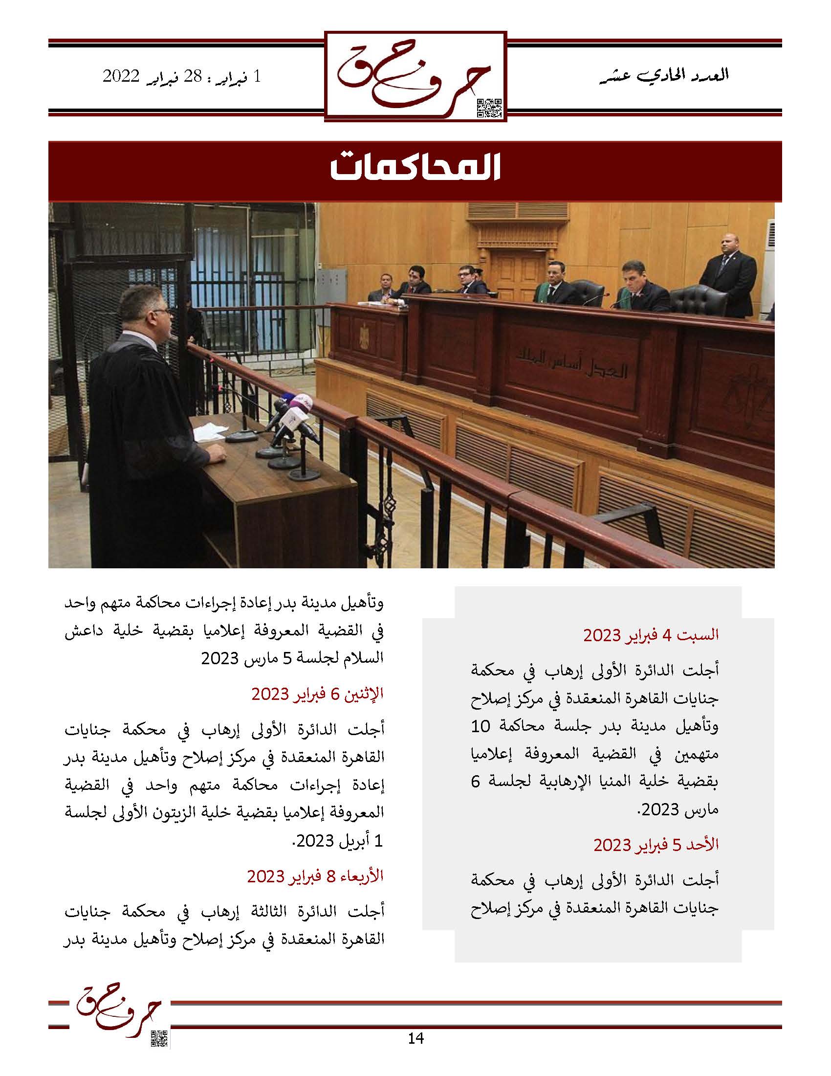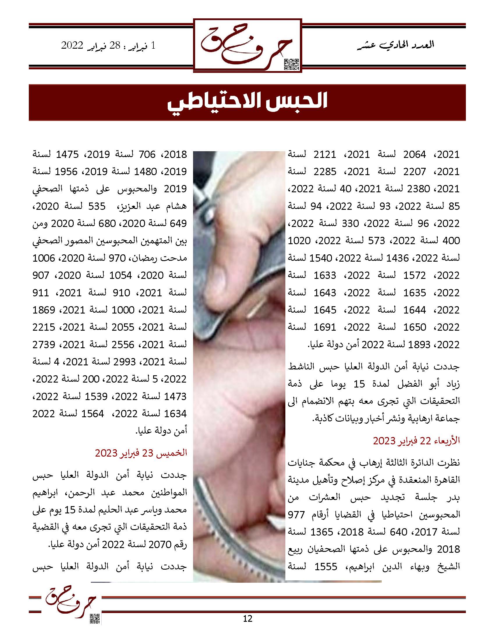 مؤسسة الحق تصدر العدد الحادي عشر من نشرتها الالكترونية ” حرف حق “ عن الفتره من 1 فبراير 2023 حتى 28 فبراير 2023
