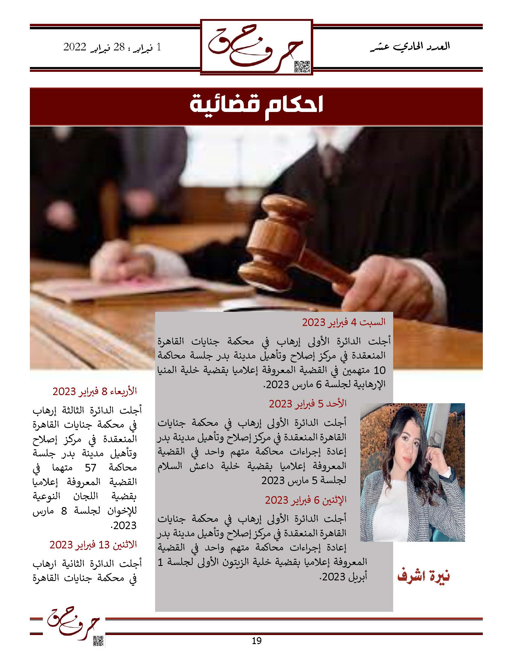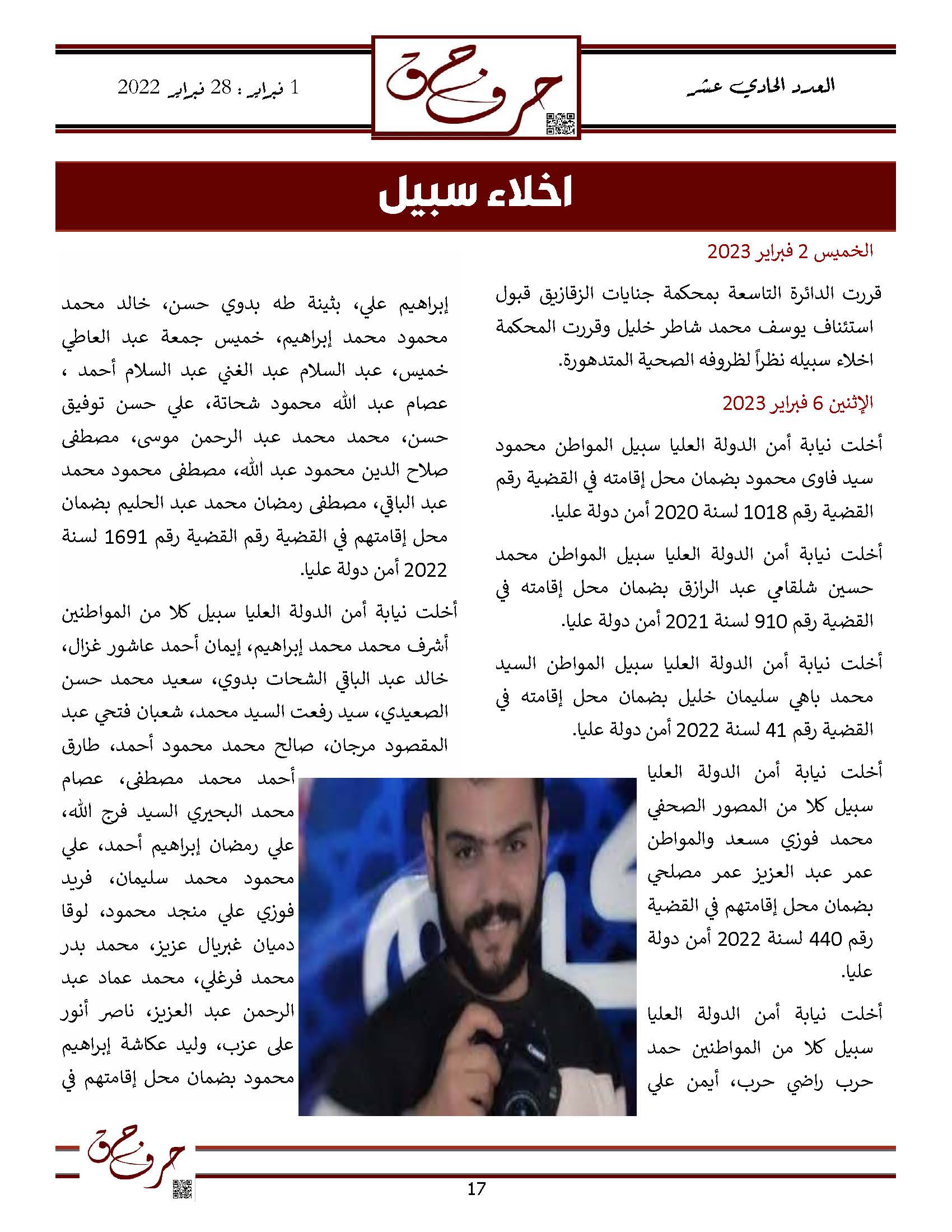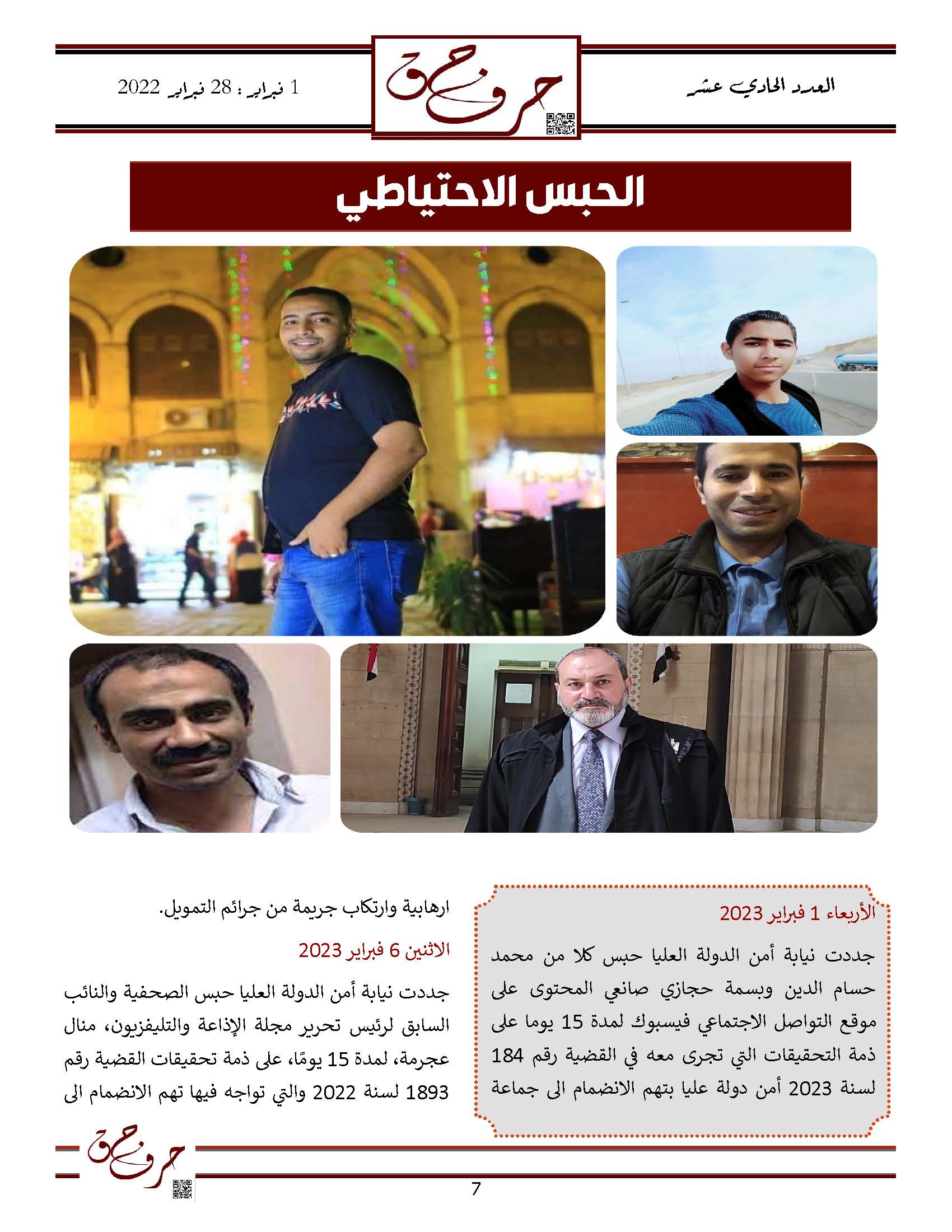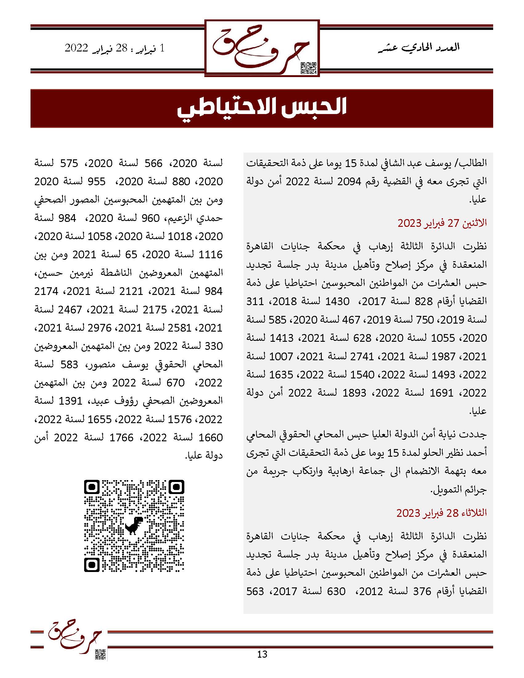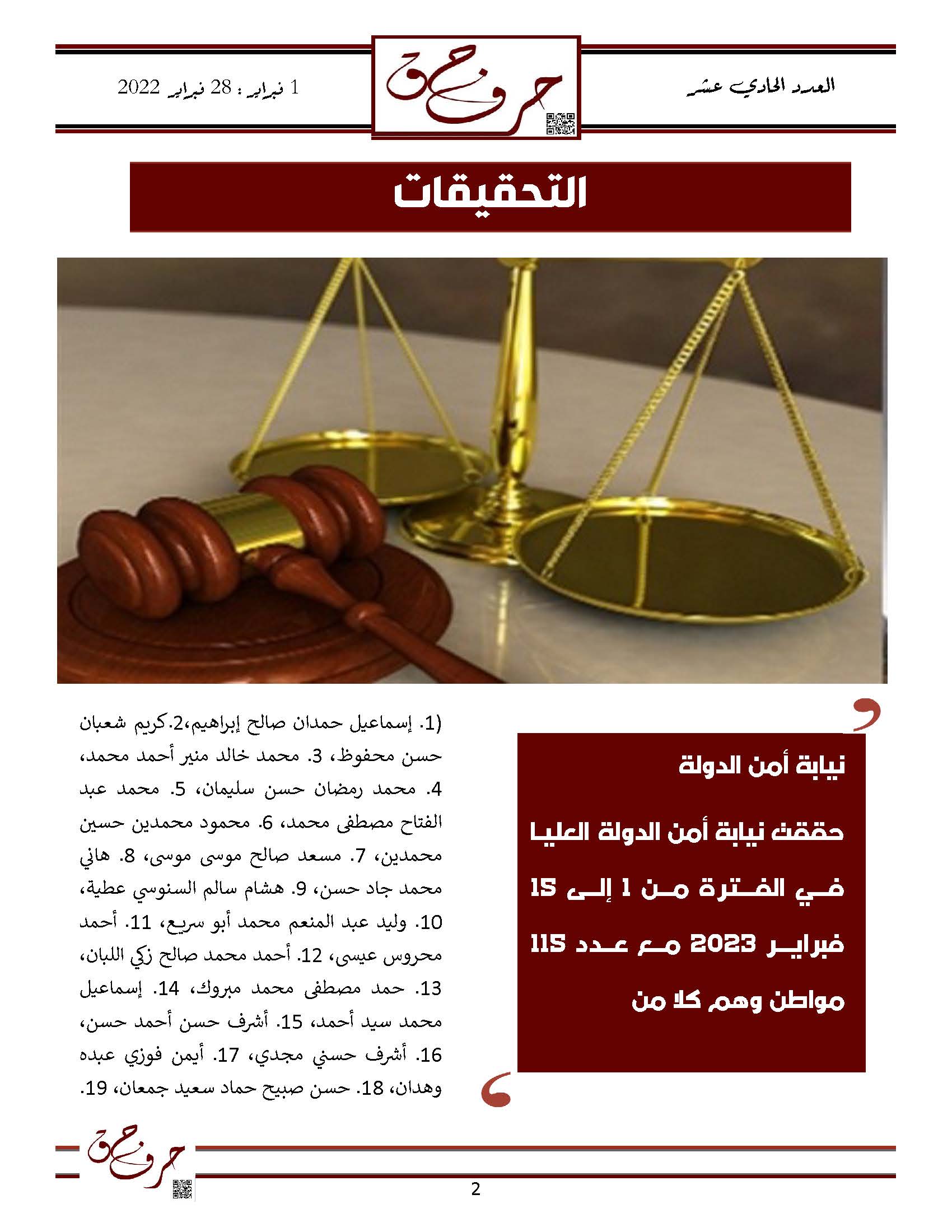 مؤسسة الحق تصدر العدد الحادي عشر من نشرتها الالكترونية ” حرف حق “ عن الفتره من 1 فبراير 2023 حتى 28 فبراير 2023