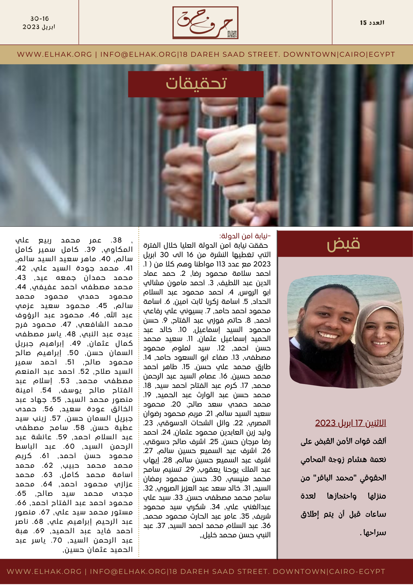 حققت نيابة أمن الدولة العليا خلال الفترة التي تغطيها النشرة من 16 الى 30 أبريل 2023 مع عدد 70 مواطنا وهم كلا من ( 1. أحمد سلامة محمود رضا، 2. حمد عماد الدين عبد اللطيف، 3. أحمد مأمون مشالي أبو الروس، 4. أحمد محمود عبد السلام الحداد، 5. أسامة زكريا ثابت أمين، 6. أسامة محمود أحمد حامد، 7. بسيوني علي رفاعي أحمد، 8. حاتم فوزي عبد الفتاح، 9. حسن محمود السيد إسماعيل، 10. خالد عبد الحميد إسماعيل عثمان، 11. سعيد محمد حسن أحمد، 12. سيد لملوم محمود مصطفى، 13. صفاء أبو السعود حامد، 14. طارق محمد علي حسن، 15. طاهر أحمد محمد حسين، 16. عصام السيد عبد الرحمن محمد، 17. كرم عبد الفتاح أحمد سيد، 18. محمد حسن عبد الوارث عبد الحميد، 19. محمد حمدي سعد صالح، 20. محمود سعيد السيد سالم، 21. مريم محمود رضوان المصري، 22. وائل الشحات الدسوقي، 23. وليد زين العابدين محمود عثمان، 24. أحمد رضا مرجان حسن، 25. أشرف صالح دسوقي، 26. أشرف عبد السميع حسين سالم، 27. أشرف عبد السميع حسين سالم، 28. إيهاب عبد الملك يوحنا يعقوب، 29. تسنيم سامح محمد منيسي، 30. حسن محمود رمضان السيد، 31. خالد سعد عبد العزيز الصروي، 32. سامح محمد مصطفى حسن، 33. سيد علي عبدالغني علي، 34. شكري سيد محمود شريف، 35. عامر عبد الحارث محمود محمد، 36. عبد السلام محمد أحمد السيد، 37. عبد النبي حسن محمد خليل، 38. عمر محمد ربيع علي المكاوي، 39. كامل سمير كامل سالم، 40. ماهر سعيد السيد سالم، 41. محمد جودة السيد علي، 42. محمد حمدان جمعه عيد، 43. محمد مصطفى أحمد عفيفي، 44. محمود حمدي محمود محمد سالم، 45. محمود سعيد عزمي عبد الله، 46. محمود عبد الرؤوف محمد الشافعي، 47. محمود فرج عبده عبد النبي، 48. ياسر مصطفى كمال عثمان، 49. إبراهيم جبريل السمان حسن، 50. إبراهيم صالح محمود صالح، 51. أحمد سمير السيد صلاح، 52. أحمد عبد المنعم مصطفى محمد، 53. إسلام عبد الفتاح صالح يوسف، 54. أمينة منصور محمد السيد، 55. جهاد عبد الخالق عودة سعيد، 56. حمدى جبريل السمان حسن، 57. زينب سيد عطية حسن، 58. سامح مصطفى عبد السلام أحمد، 59. عائشة عبد الرحمن السيد، 60. عبد الباسط محمود حسن أحمد، 61. كريم محمد محمد حبيب، 62. محمد أسامة محمد كامل، 63. محمد عزازي محمود أحمد، 64. محمد مجدى محمد سيد صالح، 65. محمود أحمد عبد الفتاح أحمد، 66. مستور محمد سيد علي، 67. منصور عبد الرحيم إبراهيم علي، 68. ناصر أحمد فايد عبد الحميد، 69. هبة عبد الرحمن السيد، 70. ياسر عبد الحميد عثمان حسين، 71. إبراهيم عبد الفتاح إبراهيم إسماعيل، 72. أحمد سمير مأمون أحمد، 73. أحمد محمد سيد حامد، 74. أمجد عبد الجليل علي إبراهيم ، 75. حنان فوزي محمد السيد السيد، 76. رفاعي محمد أحمد عطية، 77. صلاح الدين عبد العزيز محمد هويدي، 78. عبد الرحمن أحمد محمد أحمد فهمي، 79. محسن محمد جمال شحاتة، 80. محمد عبد الله علي عبد الله، 81. محمد محمد طلعت سالم، 82. أحمد فتحي إسماعيل سلام، 83. أحمد محمد مدحت حسن، 84. إسماعيل حسن مرزوق أحمد، 85. إسماعيل محمود إبراهيم محمد، 86. أشرف حسن أحمد حامد، 87. إيهاب أحمد محمد الملاح، 88. خالد أحمد زكريا محمد، 89. صلاح عبد العاطي عطية إسماعيل، 90. عبد الحميد محمد عبد الحميد الحسيني، 91. عبد السلام محمود عبد السلام، 92. علاء محمد صبري محمد، 93. علي عبد الرحمن سعد السيد، 94. علي عثمان علي عثمان، 95. محمد حمدي محمد كمال الدين، 96. محمد سلامة سعداوي اسماعيل، 97. مصطفى محمود عبد الوهاب إسماعيل ، 98. ناصر حسن أحمد حسن، 99. وليد عبد المنعم درويش مصطفى، 100. ياسر محمد محمود السيد، 101. أحمد حسين محمد علي سليمان، 102. أحمد سعد رفاعي أحمد، 103. أحمد سيد زايد محمد، 104. أحمد ياسين مجدي سليمان، 105. أشرف حسن محمد أحمد، 106. حسن السيد سليمان إبراهيم، 107. خالد فوزي أحمد مصطفى، 108. سعد محمد أحمد عبد العال، 109. ضياء الدين محمد محمود، 110. عبد العزيز محمد أحمد السيد، 111. محمد السيد البيومي علي، 112. محمد فرجاني فرج محمود، 113. ناصر محمد أحمد عبد الجليل)