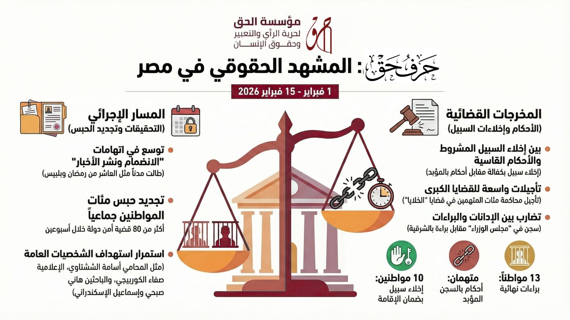 الخميس 12 فبراير 2026: أطلقت قوات الأمن في مركز شرطة العاشر من رمضان المواطن/ بنداري صلاح بنداري بعد الانتهاء من إجراءات إخلاء سبيله ووصول إشارة الأمن الوطني.